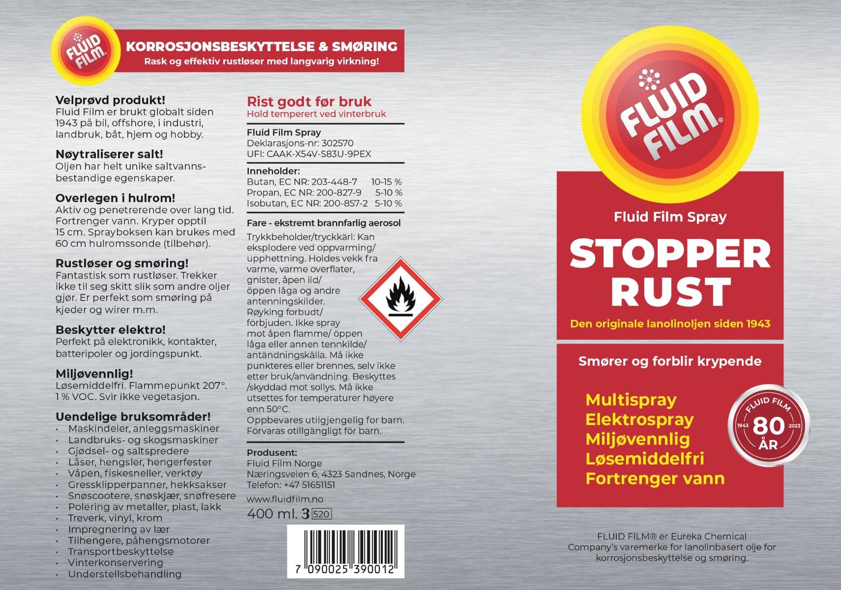 Fluid Film Spray er et kraftig, lanolinbasert smøremiddel og rustbeskyttelsesprodukt uten løsemidler. Den unike NAS‑formelen har vært brukt verden over siden 1940‑tallet – på skip, offshore, i landbruk, industri og i hjemmet – og er kjent for sine utrolig holdbare og saltvannsbestandige egenskaper.